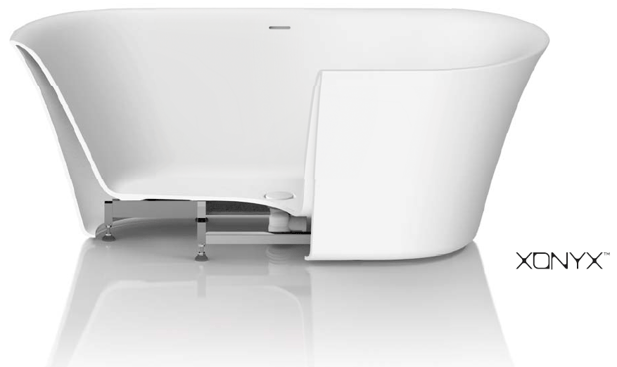 Die Xonyx-Badewannen stehen auf einen stabilen verzinkten Unterrahmen mit in der Höhe verstellbaren Füßen, die von außen unsichtbar sind. Eine neuartige Konstruktion bietet zusätzlichen Raum für verdeckten Abwasseranschluss unter der Badewanne und ermöglicht so eine einfache Installation ohne Änderung des Badezimmerbodens.